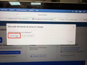 Dans la fenêtre « Nouvelle demande de prise en charge », pour la question » quel est l’objet de votre demande », cliquer sur le bouton « Une formation »