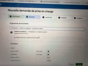 A l’étape 2, « Demande », indiquer Essentia Conseils » dans le cadre et sélectionner notre organisme qui est référencé sur le nom : 11754800975 – ESSENTIA CONSEILS – 441 886 223 00037″