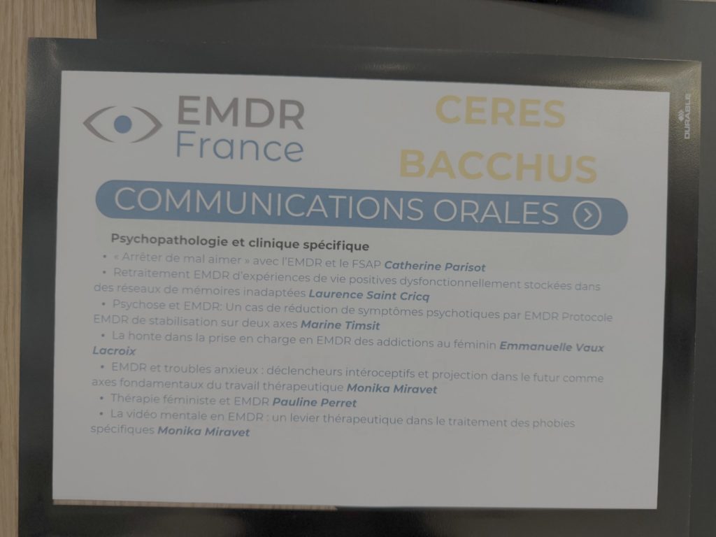 - « La vidéo mentale en EMDR : un levier thérapeutique dans le traitement des phobies spécifiques » (communication)