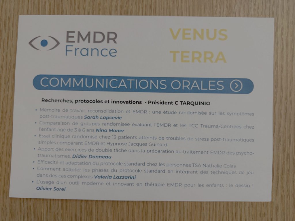 - « EMDR et troubles anxieux : déclencheurs intéroceptifs et projection dans le futur comme axes fondamentaux du travail thérapeutique » (communication)