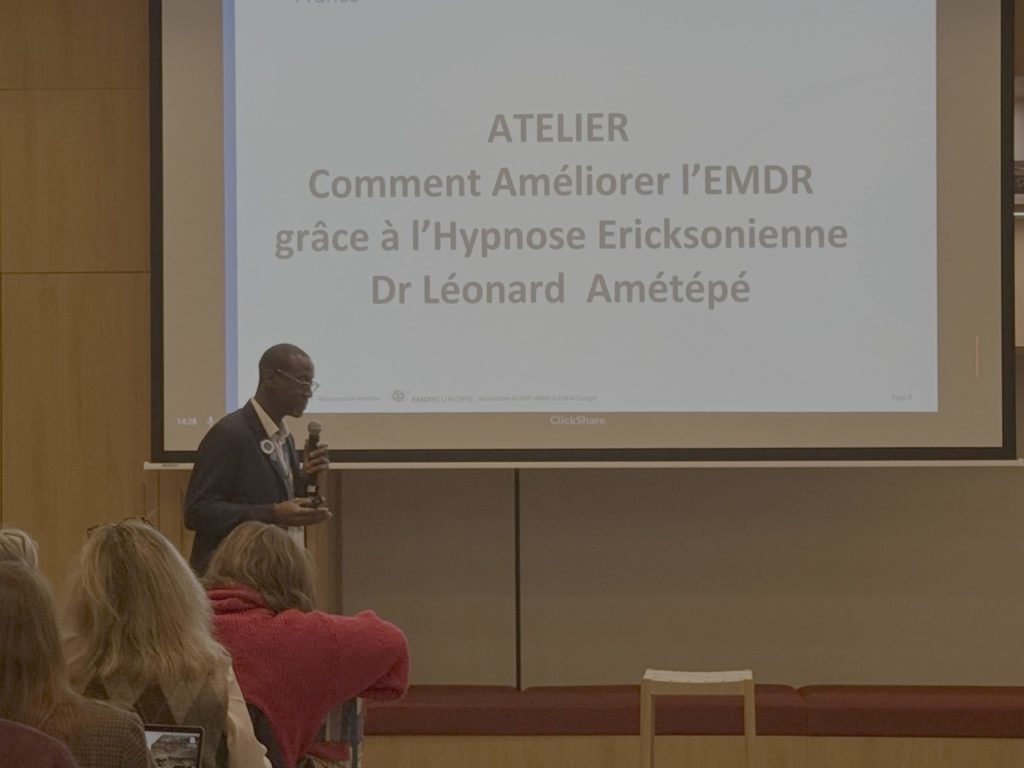 Léonard Amétépé a proposé un atelier sur « Comment améliorer l’EMDR grâce à l’hypnose ericksonienne ». Pratique millénaire utilisée depuis des siècles dans le cadre du psychotraumatisme, notamment par Janet qui a conceptualisé le traitement en trois temps toujours d’actualité, l’hypnose occupe une place importante dans tout le protocole de l’EMDR. Elle intervient notamment en termes de suggestion solutioniste, dans les exercices de stabilisation (lieu sûr, installation de ressources), dans les techniques de distanciation (contenant et téléviseur), d’apaisement (le faisceau lumineux) et les explorations (le float back et le pont d’affect).