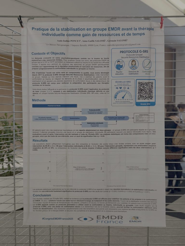 Le prix du meilleur poster, décerné suite au vote des congressistes, a été attribué à Aude-Isoline Poncet, Anne-Gaëlle Salomé et Germain Salomé de La Maison Thérapeutique (Lyon) pour leur étude intitulée « Pratique de la stabilisation en groupe EMDR avant la thérapie individuelle comme gain de ressources et de temps ».