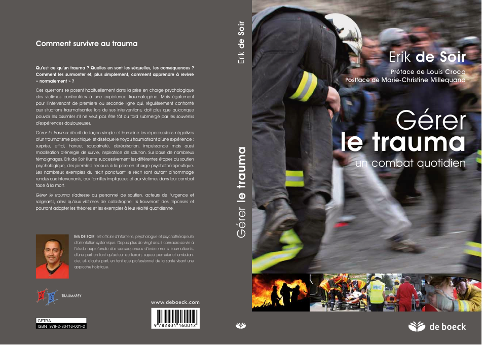 - DE SOIR, E. (1999). La gestion du stress traumatique chez les sapeurs-pompiers et les ambulanciers. Expériences avec le débriefing psychologique en Belgique, Médecine de Catastrophe Urgence Collective, 1999 ; 2 :139-52.